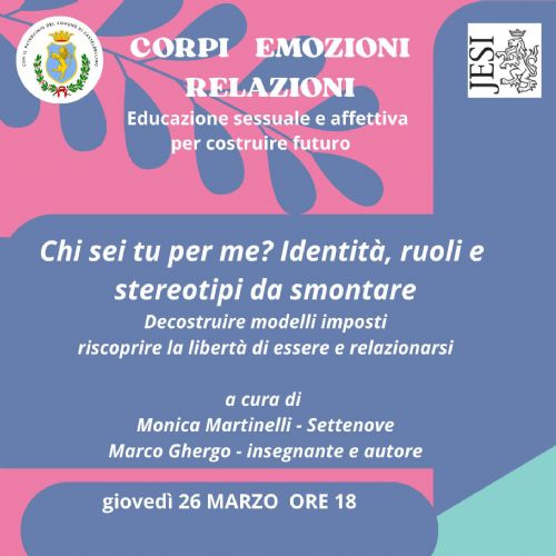 Giovedì 26 marzo, alle 18.00, incontro "Chi sei tu per me? Identità, ruoli e stereotipi da smontare. Decostruire modelli imposti e riscoprire la libertà di essere e relazionars" con Monica Martinelli e Marco Ghergo.