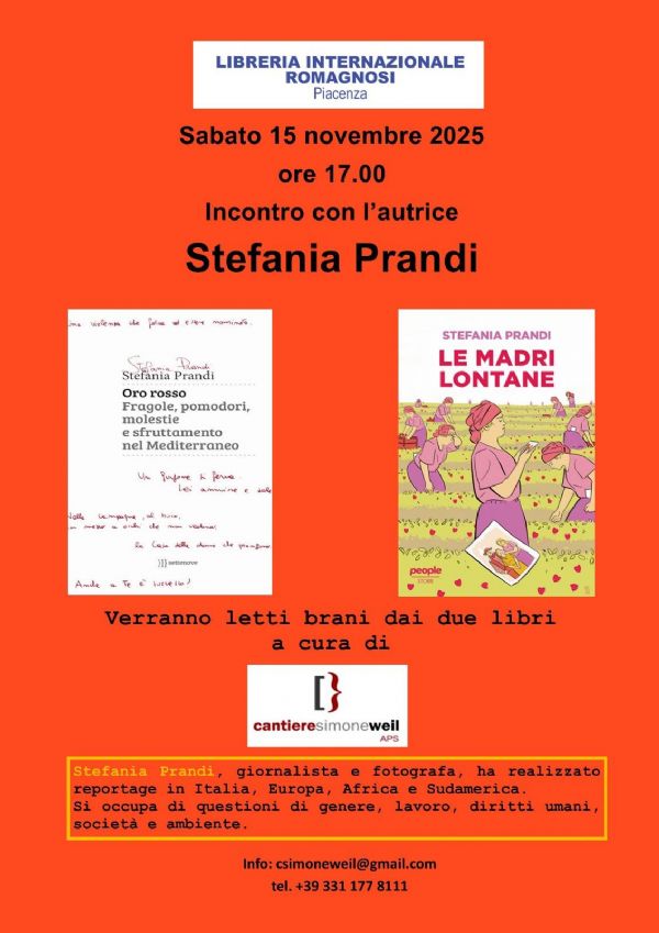 la giornalista, fotografa e scrittrice Stefania Prandi presenterà i suoi libri Oro Rosso e Le madri lontane in dialogo con il Cantiere Simone Weil.