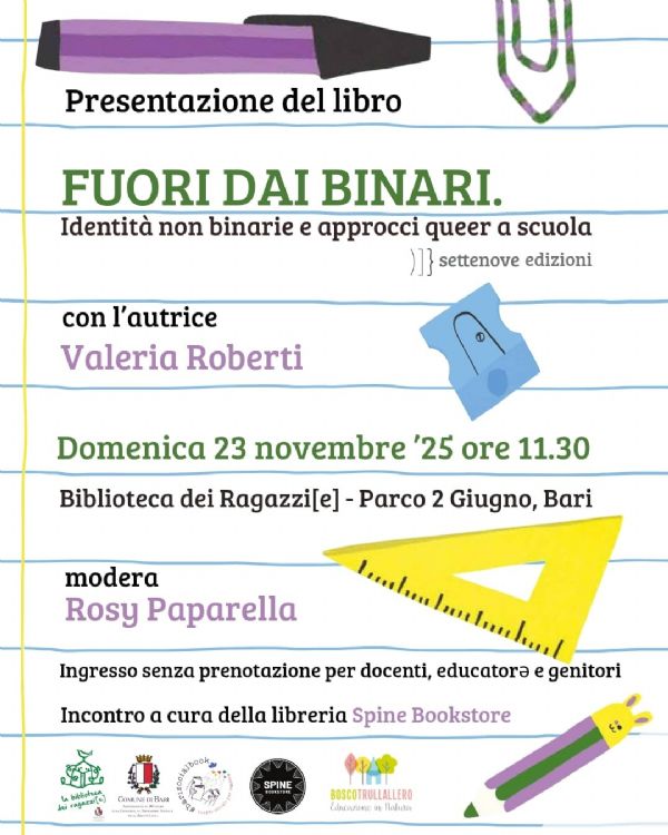 Domenica 23 dicembre, alle 11.30, presentazione di Fuori dai binari. Identità non binarie e approcci queer a scuoladi e con Valeria Roberti in dialogo con Rosy Paparella alla Biblioteca dei Ragazzi[e] di Bari. Un incontro per parlare di identità non binarie e scuola.